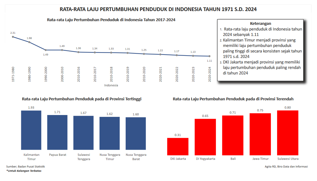 Visualiasasi ini menunjukkan data rata-rata laju pertumbuhan penduduk di Indonesia sejak tahun 1971 sampai dengan 2024. Dari data yang ditampilkan terlihat laju pertumbuhan penduduk Indonesia menurun secara konsisten setiap tahunnya.