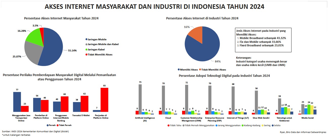 Visualisasi ini menyampaikan beberapa infografis diantaranya data akses internet masyarakat dan industri tahun 2024, data pemanfaatan teknologi oleh industri, dan pemanfaatan media oleh masyarakat