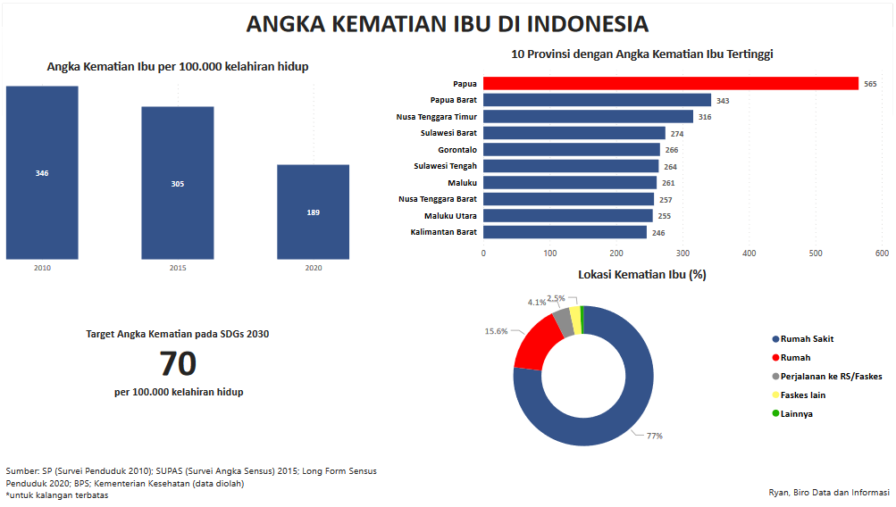 Visualisasi ini menampilkan data Kematian Ibu per 100.000 kelahiran hidup berdasarkan Survei Penduduk tahun 2010, Survei Angka Sensus tahun 2015 dan Long Form Sensus Penduduk tahun 2020. Data tersebut sebagai acuan untuk menurunkan angka kematian ibu (AKI) sesuai dengan target SDGs pada tahun 2030 sebesar 70 kematian ibu per 100.000 kelahiran hidup. Terdapat 10 Provinsi tertinggi dengan Angka Kematian Ibu serta lokasi kematian ibu.