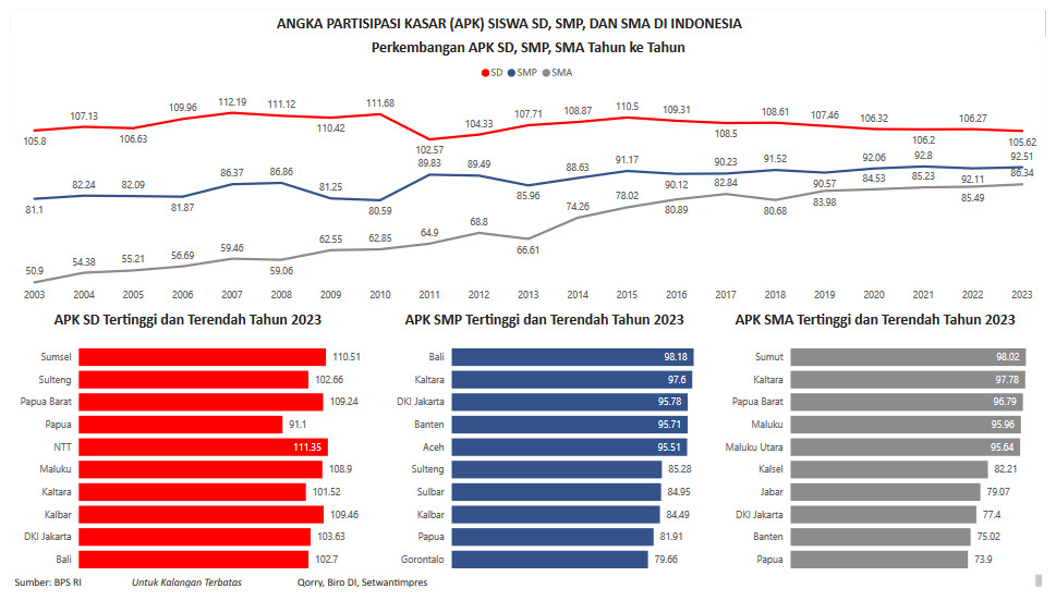 Visualisasi Angka Partisipasi Kasar (APK) SD, SMP, SMA di Indonesia yang diolah dari BPS RI. Perbandingan antara jumlah penduduk yang masih bersekolah di jenjang pendidikan tertentu (tanpa memandang usia penduduk tersebut) dengan jumlah penduduk yang memenuhi syarat resmi penduduk usia sekolah di jenjang pendidikan yang sama. Sejak tahun2007, Pendidikan Non Formal (Paket A, Paket B, dan Paket C) turut diperhitungkan.