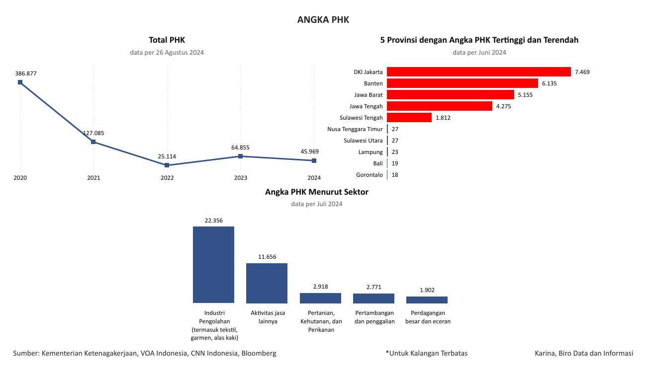 Visualisasi ini menampilkan Angka PHK Tahun 2020 s.d. 2024, 5 Provinsi dengan Angka PHK Tertinggi dan Terendah, dan Angka PHK Menurut Sektor. Data bersumber dari Kementerian Ketenagakerjaan, VOA Indonesia, CNN Indonesia, dan Bloomberg.