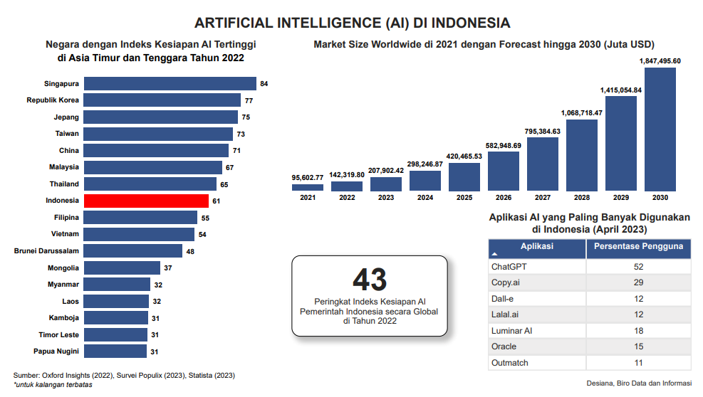 Visualisasi ini menampilkan data indeks kesiapan AI tertinggi negara-negara di Asia Timur dan Tenggara pada tahun 2022, market size worldwide AI di 2021 dengan forecast hingga 2030, serta aplikasi AI yang paling banyak digunakan di Indonesia pada tahun 2023. Data dapat diakses melalui Oxford Insights, Survei populix, dan Statista. Data yang ditampilkan update per Juli 2023.