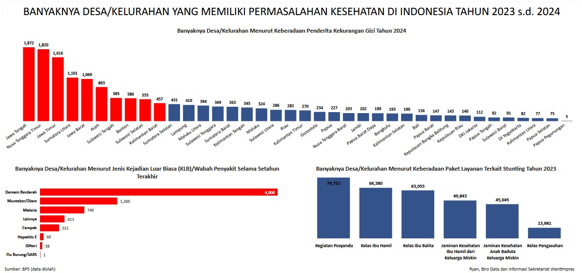 Visualisasi ini menyajikan banyaknya desa atau kelurahan yang memiliki permasalahan kesehatan di Indonesia pada tahun 2023 s.d. 2024. Permasalahan diantaranya Kejadian Luar Biasa (KLB), penderita kurang gizi, serta pelayanan terkait Stunting.