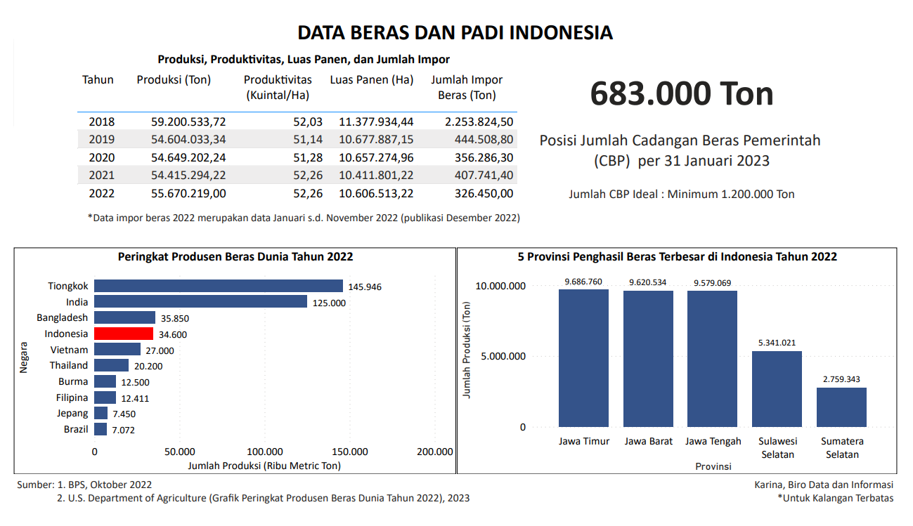 Visualisasi ini menampilkan data produksi padi, produktivitas, luas panen, impor beras, jumlah Cadangan Beras Pemerintah per 31 Januari 2023, jumlah produksi beberapa negara, dan provinsi penghasil beras terbesar di Indonesia. Data ini bersumber dari BPS dan US Department of Agriculture.