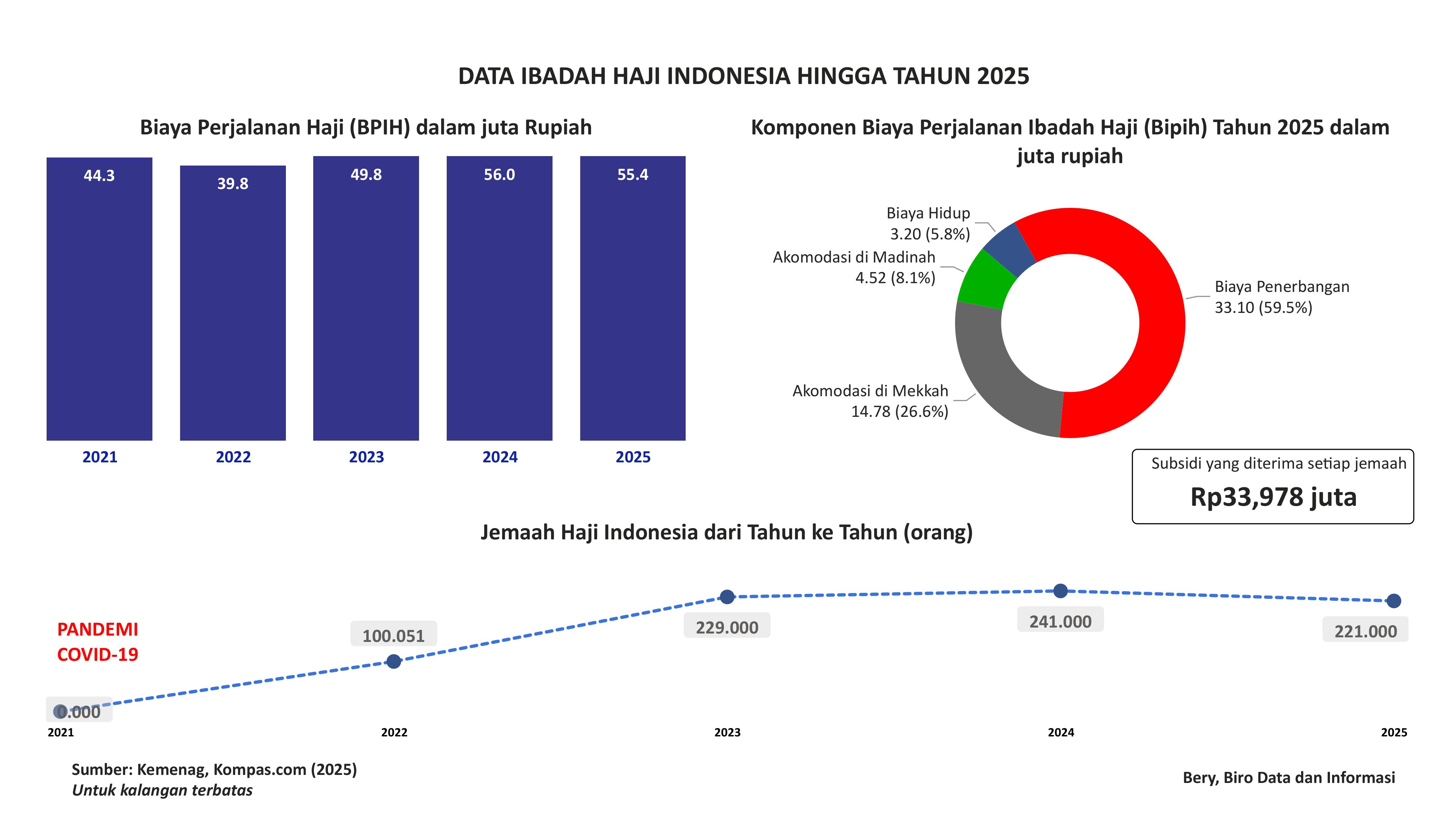 Visualisasi ini menampilkan data biaya perjalanan haji, komponen biaya perjalanan haji Indonesia serta jumlah jamaah haji Indonesia dari tahun ke tahun. Data diperoleh dari dan dapat diakses pada Kementerian Agama dan media Kompas.com. Data yang ditampilkan berdasarkan akses terakhir Mei 2025.