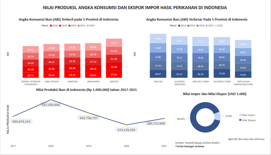 Visualisasi ini menampilkan data tren nilai produksi Ikan di Indonesia selama tahun 2017 s.d. 2021, angka komsumsi Ikan pada 5 provinsi baik yang terendah dan tertinggi serta nilai ekspor dan impor ikan.