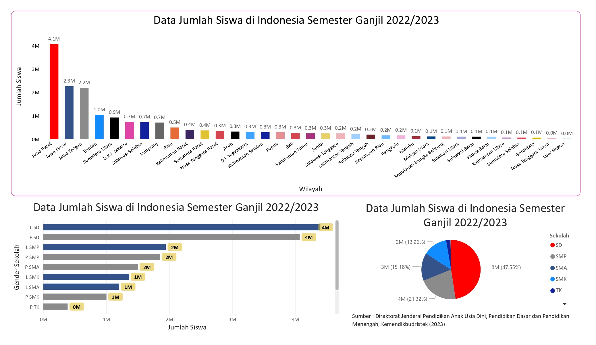Visualisasi ini menyajikan data jumlah Siswa di Indonesia pada semester ganjil 2022/2023 dan jumlah siswa secara gender dari TK sampai dengan SMA