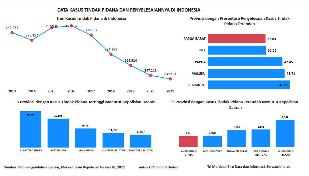 Visualisasi data ini menyajikan data tren tindak pidana di Indonesia yang semakin tahun menurun, 5 Provinsi dengan kasus tindak pidana tertinggi dan terendah menurut Kepolisian Daerah, serta 5 Provinsi dengan presentase penyelesaian kasus tindak pidana terendah