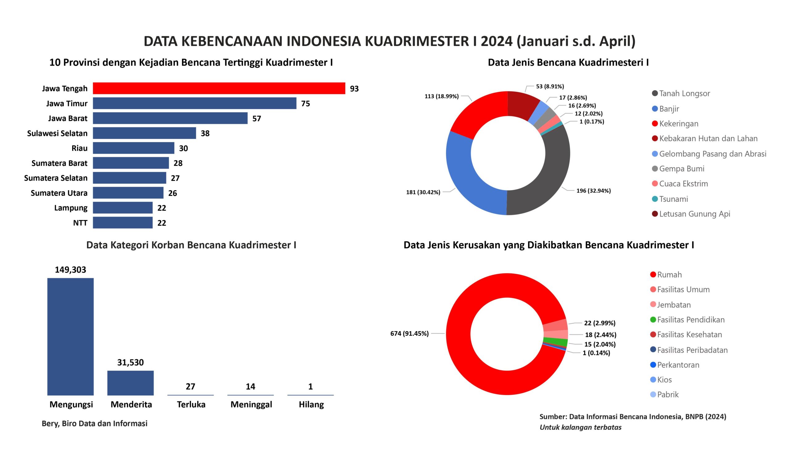 Visualisasi ini menampilkan statistik dari data bencana Indonesia pada kuadrimester I (Januari s.d. April) tahun 2024. Data tersebut menampilkan provinsi tertinggi, jenis bencana, kategori korban dan jenis kerusakan. Data tersebut diperoleh dari Data Informasi Bencana Indonesia tahun 2024 sebagaiman diakses pada Mei 2024.