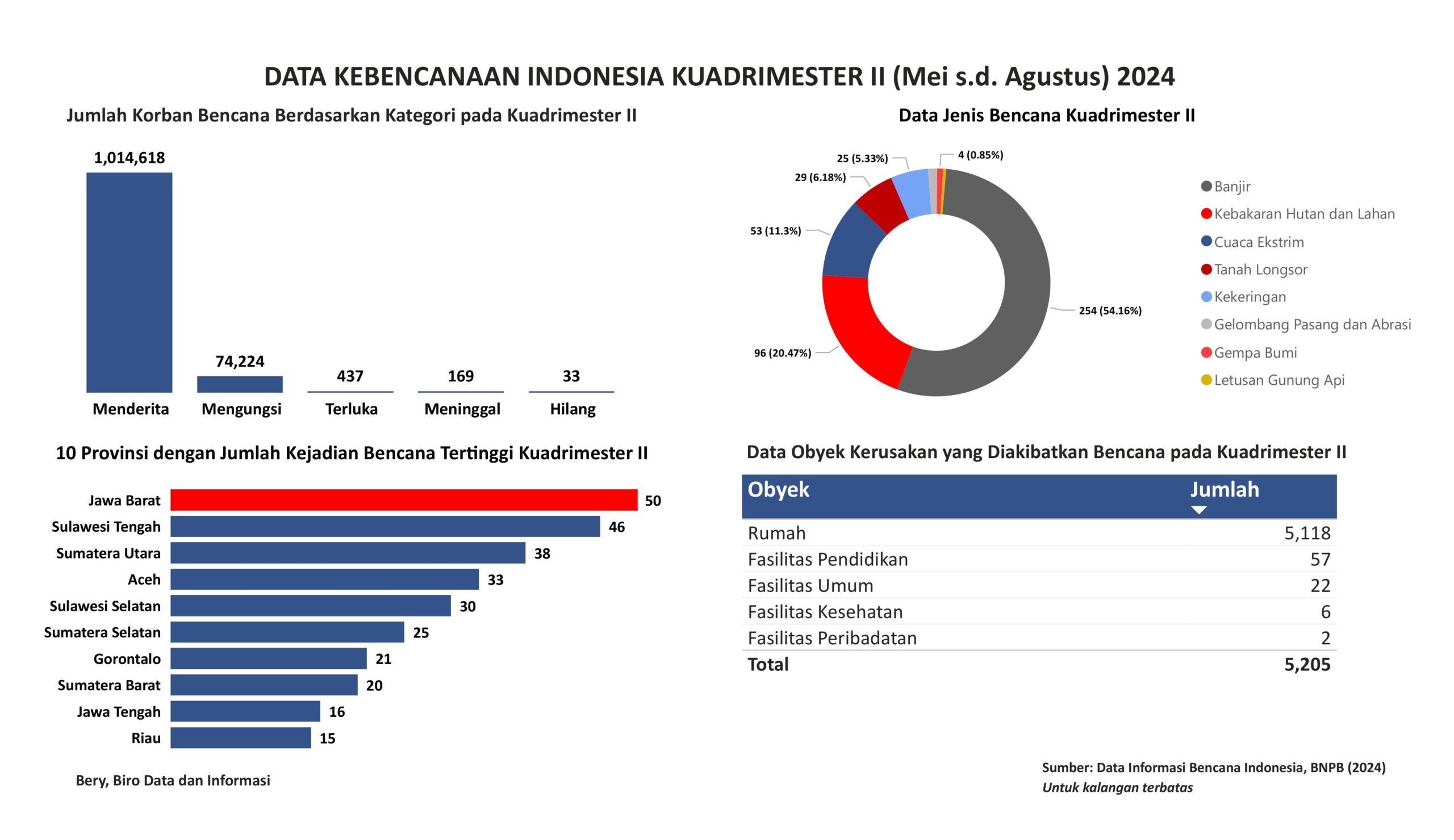 Visualisasi ini menampilkan statistik dari data bencana Indonesia pada kuadrimester II (Mei s.d. Agustus) tahun 2024. Data tersebut menampilkan provinsi tertinggi, jenis bencana, kategori korban dan jenis kerusakan. Data tersebut diperoleh dari Data Informasi Bencana Indonesia milik Badan Nasional Penanggulangan Bencana tahun 2024 sebagaiman diakses pada November 2024.