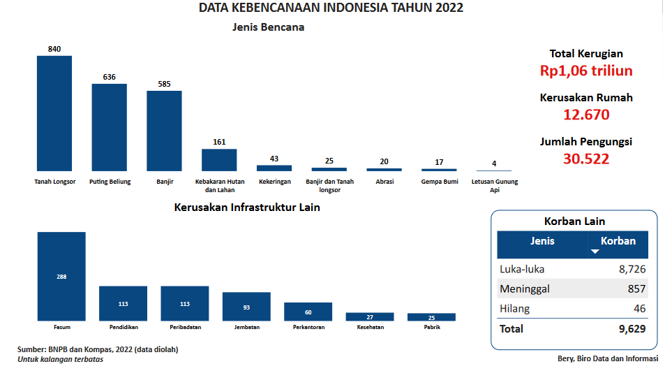 Visualisasi ini menampilkan data bencana di Indonesia berdasarkan jenis bencana, kerusakan infrastruktur, jumlah korban, jumlah pengungsi dan total kerugian secara keseluruhan. Data diperoleh dan dapat diakses melalui laman Badan Nasional Penanggulangan Bencana (BNPB) dan Kompas. Data yang ditampilkan berdasarkan update per Maret 2023.