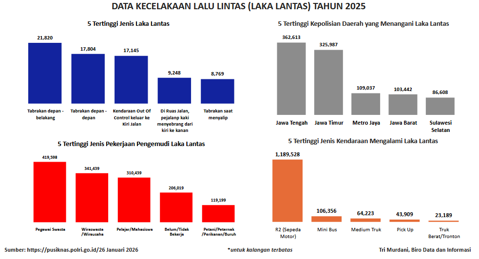 Kecelakaan lalu lintas tahun 2025, masih di dominasi dengan 5 jenis kendaraan roda dua (R2) dengan jumlah kejadian sebanyak 1,189,528, di ikuti dengan jenis kendaraan Mini Bus, dengan jumlah kejadian sebanyak 106,356, medium truck sebanyak 64,223, pick up sebanyak 43,909, dan truk berat/Tronton sebanyak 23,189 kejadian. Posisi Laka lantas terbanyak diduduki oleh Polda Jawa Tengah ditangani 362,613 kasus, Polda Jawa Timur sebanyak 325,987 kasus, Polda Metro Jaya sebanyak 109,037 kasus, Polda Jawa Barat sebanyak 103,442 kasus, dan Polda Sulawesi Selatan sebanyak 86,608 kasus.