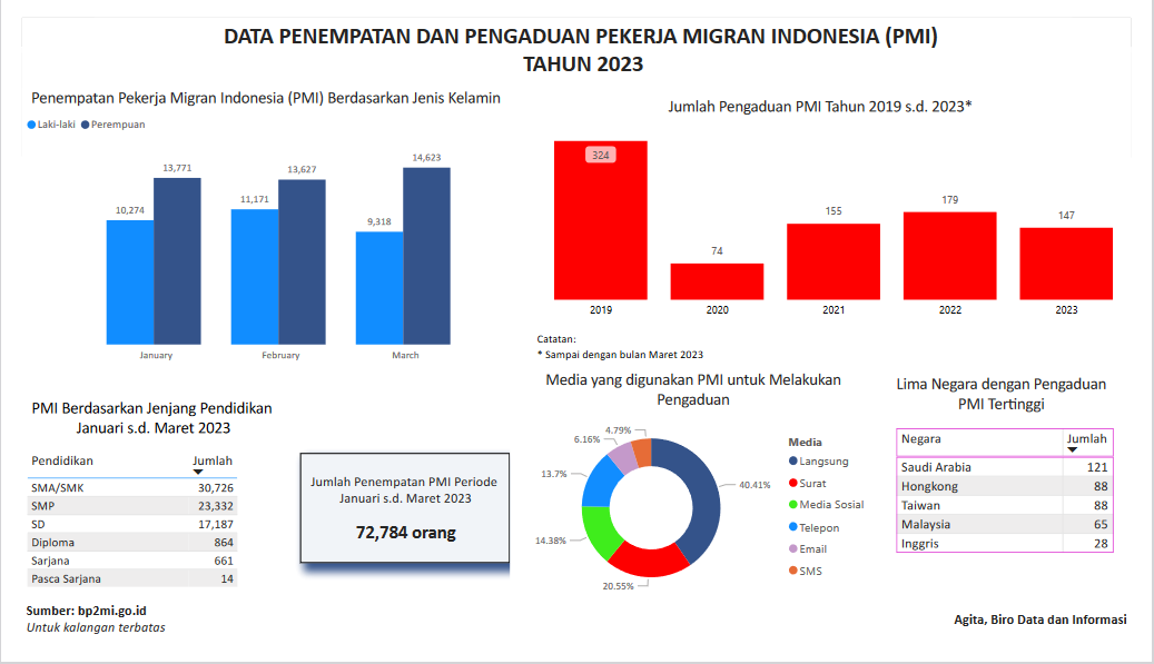 Visualiasasi ini menyajikan data terkait penempatan PMI selama bulan Januari s.d. Maret 2023. Berdasarkan data dimaksud ada sebanyak 72.784 orang Indonesia bekerja sebagai pekerja migran, dan 42 ribu diantaranya berjenis kelamin perempuan, sehingga dapat diambil kesimpulan komposisi perempuan yang bekerja sebagai PMI lebih besar dibanding Laki-laki. Dilihat dari pendidikannya, tidak semua PMI berpendidikan rendah, beberapa diantaranya bahkan mengenyam pendidikan S2. Visualisasi ini juga menampilkan tren jumlah pengaduan PMI dari 2019 s.d. Maret 2023. Data yang ditampilkan bersumber dari Badan Perlindungan Pekerja Migran Indonesia.
