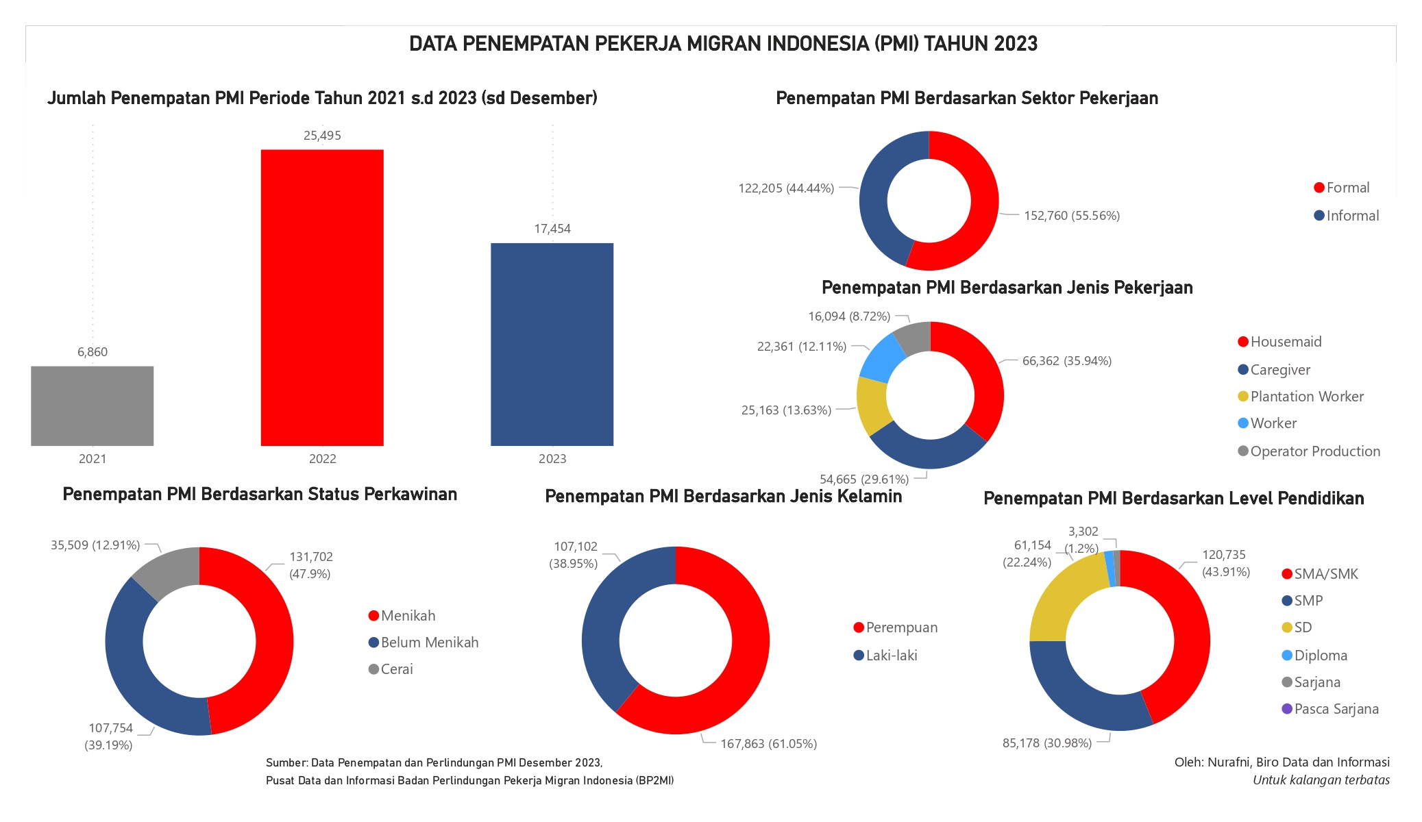 Visualisasi menunjukkan penempatan Pekerja Migran Indonesia (PMI) tahun 2023. Data menunjukkan penempatan PMI mengalami penurunan di tahun 2023 bila dibandingkan dengan tahun 2022. Di tahun 2023, pekerja migran yang ditempatkan hanya sebanyak 17.454 orang, sementara di tahun 2022 ada sebanyak 25.495 orang.