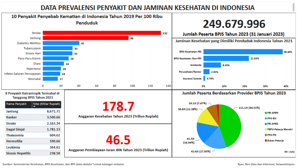 Visualisasi ini menampilkan beberapa data diantaranya mengenai data 10 penyakit penyebab kematian di Indonesia tahun 2019 per 100.000 penduduk paling banyak yaitu penyakit stroke dan jantung. Dalam visualisasi ini juga terdapat 8 penyakit katrastropik termahal yang ditanggung oleh BPJS Tahun 2021. Selain prevalensi penyakit, dalam visualisasi ini terdapat jumlah peserta BPJS Kesehatan per 31 Januari 2023 beserta providernya.