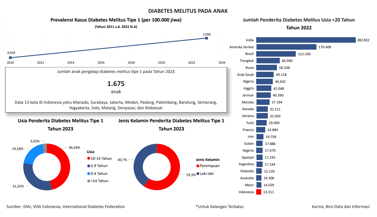 Visualisasi ini menampilkan data prevalensi kasus diabetes melitus tipe 1 pada anak tahun 2010 dan 2023, jumlah anak pengidap diabetes melitus tipe 1 pada tahun 2023, dan negara dengan jumlah penderita diabetes melitus usia kurang dari 20 tahun tertinggi pada tahun 2023. Data bersumber dari IDAI dan International Diabetes Federation.