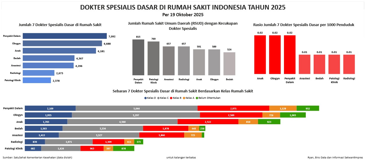 Visualisasi ini menyampaikan beberapa informasi terkait dengan jumlah 7 dokter spesialis dasar di Rumah Sakit, jumlah RSUD dengan kecukupan dokter spesialis, Rasio Jumlah Dokter Spesialis per 1000 penduduk, serta sebaran 7 Dokter Spesialis dasar di RS berdasarkan kelas rumah sakit