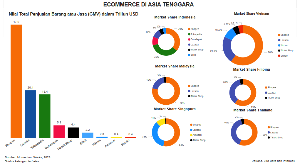 Visualisasi ini menampilkan data nilai total penjualan barang atau jasa (GMV) dan market share e-commerce di negara-negara Asia Tenggara pada tahun 2023. Data dapat diakses melalui Momentum Works. Data yang ditampilkan update per Juni 2023.