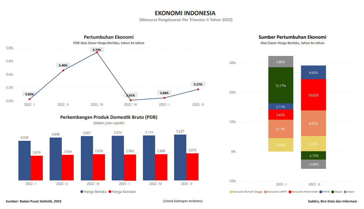 Visualisasi ini menampilkan data perekonomian Indonesia, termasuk perkembangan nominal PDB, pertumbuhan ekonomi serta sumber pertumbuhan ekonomi. Data dapat diakses melalui website Badan Pusat Statistik. Data yang ditampilkan merupakan data sangat sangat sementara update per bulan Agustus 2023.