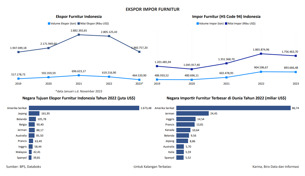 Visualisasi ini menampilkan data Ekspor Furnitur Indonesia, Impor Furniture (HS Code 94) Indonesia, Negara Tujuan Ekspor Furnitur Indonesia Tahun 2022, dan Negara Importir Furnitur Terbesar di Dunia Tahun 2022. Data bersumber dari BPS dan Databoks.
