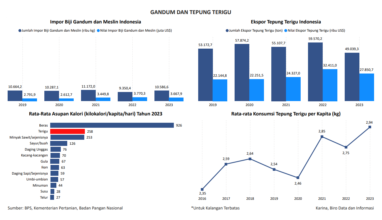 Visualisasi ini menampilkan data Impor Biji Gandum dan Meslin Indonesia, Ekspor Tepung Terigu Indonesia, Rata-Rata Asupan Kalori Tahun 2023, dan Rata-Rata Konsumsi Tepung Terigu per Kapita. Data bersumber dari BPS, Kementerian Pertanian, dan Badan Pangan Nasional.