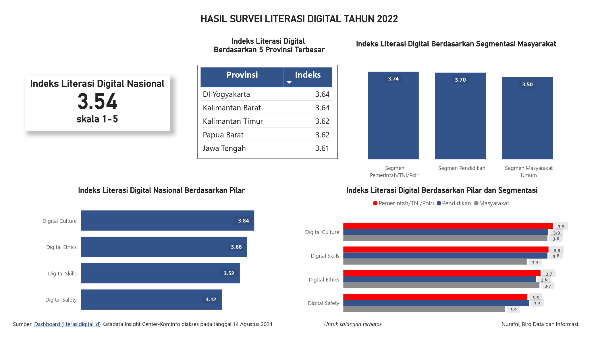 Visualisasi menampilkan hasil survei literasi digital tahun 2022 yang dilakukan oleh Kementerian Komunikasi dan Informatika dengan Katadata Insight Center. Hasil survei menunjukkan, secara nasional indeks literasi digital Indonesia adalah 3.54 dari skala 1-5. 5 provinsi yang memiliki indeks literasi digital tertinggi adalah DI Yogyakarta, Kalimantan Barat, Kalimantan Timur, Papua Barat, dan Jawa Tengah.