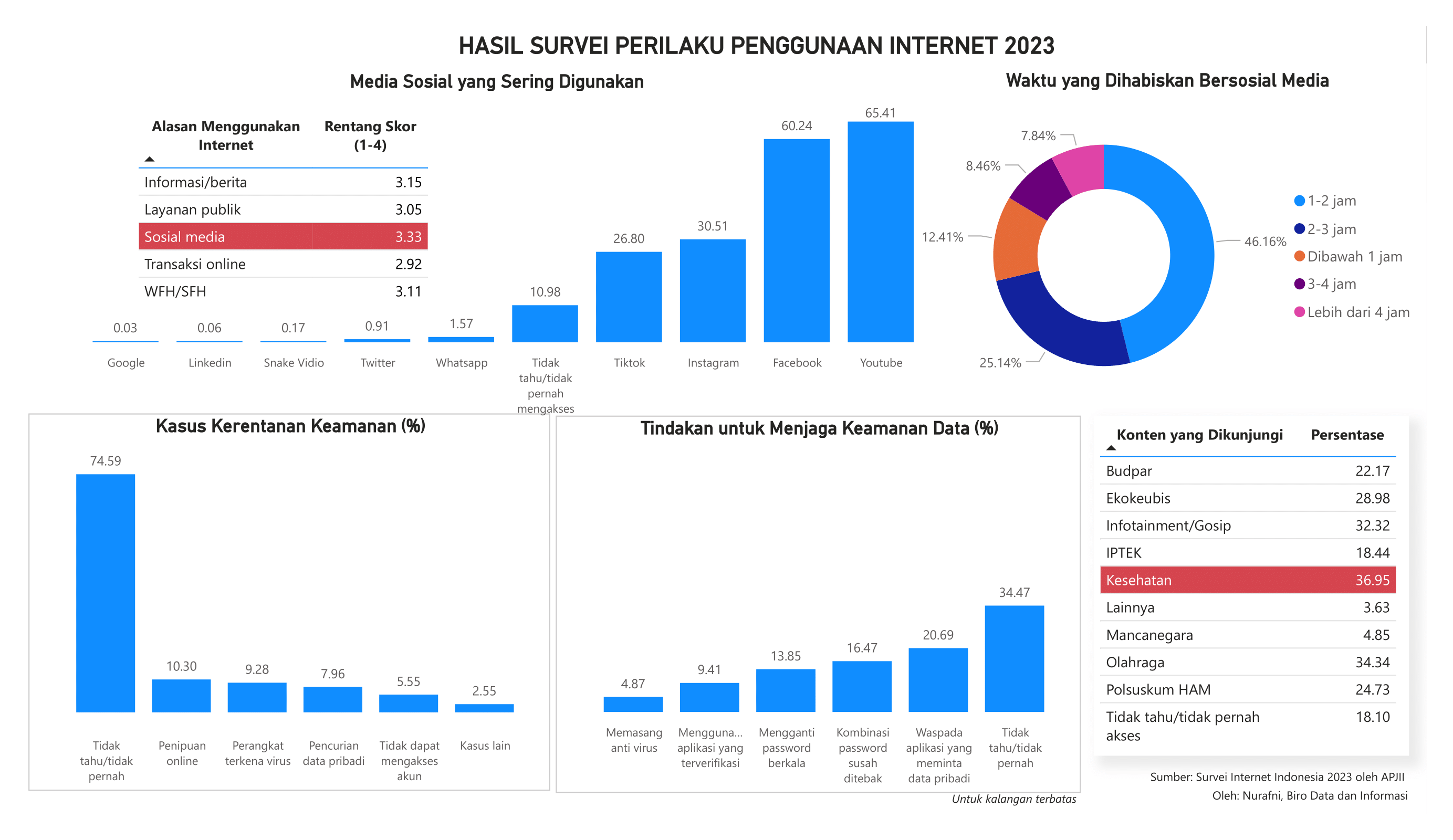 Visualisasi menampilkan hasil survei perilaku penggunaan internet tahun 2023 yang dilakukan oleh Asosiasi Penyelenggara Jasa Internet Indonesia (APJII).