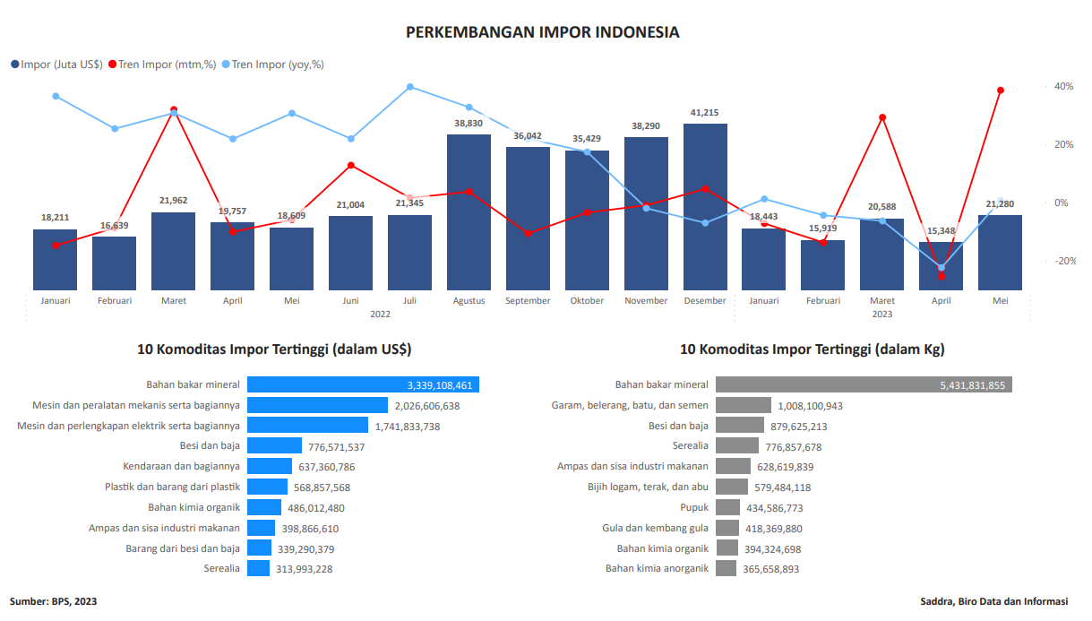 Visualisasi yang ditampilkan data nilai impor Indonesia dan perkembangannya, serta 10 komoditas impor tertinggi menurut nilai dan volume. Data dapat diakses melalui website Badan Pusat Statistik. Data yang ditampilkan update bulan Mei 2023.
