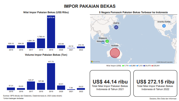 Visualisasi ini menampilkan data nilai dan volume impor pakaian bekas Tahun 2015-2022 serta 5 negara pemasok pakaian bekas terbesar ke Indonesia. Data dapat diakses melalui BPS, Databoks, dan DataIndonesia.id. Data yang ditampilkan update per Maret 2023.