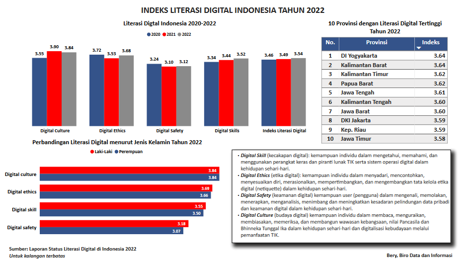Visualisasi ini menampilkan indeks literasi digital Indonesia pada tahun 2022 dengan rincian skor bagi 10 provinsi dengan skor indeks literasi digital tertinggi serta perbandingan kecakapan digital (digital culture, digital ethics, digital skill, dan digital safety). Data yang ditampilkan bersumber dari Laporan Status Literasi Digital di Indonesia 2022.