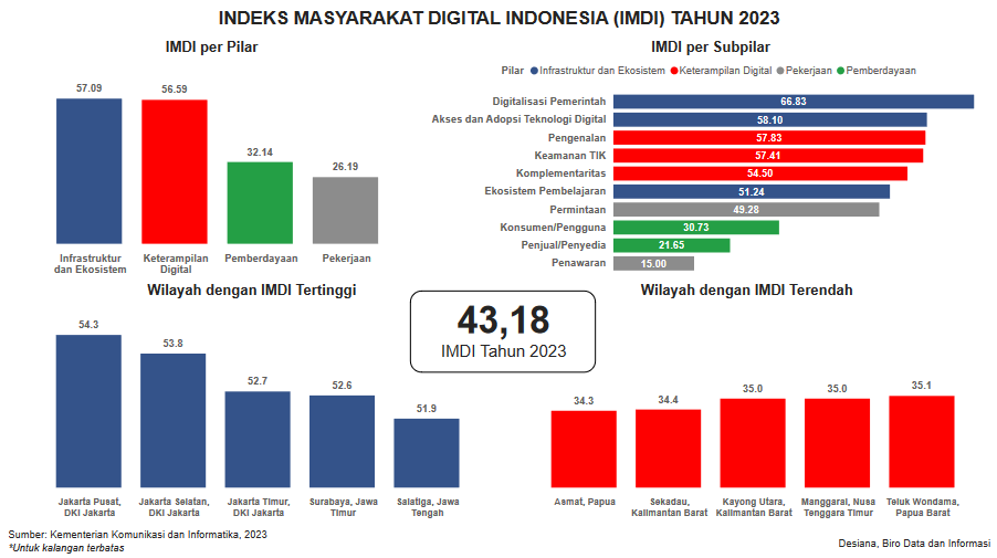 Visualisasi ini menampilkan data indeks masyarakat digital Indonesia (IMDI), IMDI per pilar dan subpilar, serta wilayah dengan IMDI tertinggi dan terendah pada tahun 2023. Data dapat diakses melalui website Kementerian Komunikasi dan Informatika. Data yang ditampilkan update per Mei 2024.