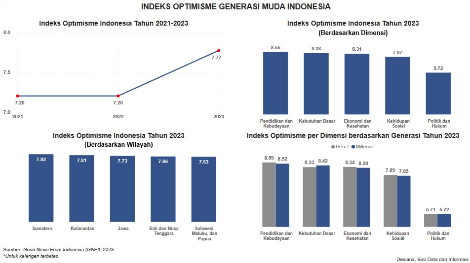 Visualisasi ini menampilkan data indeks optimisme Indonesia pada tahun 2021-2023 dan indeks optimisme Indonesia pada tahun 2023 berdasarkan wilayah, dimensi, dan generasi. Data dapat diakses melalui Good News From Indonesia (GNFI). Data yang ditampilkan update per Desember 2023.