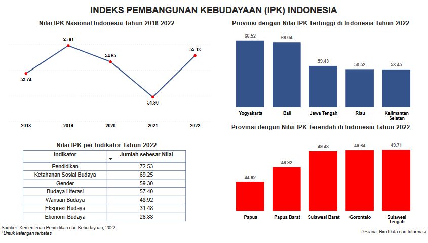 Visualisasi ini menampilkan data indeks pembangunan kebudayaan (IPK) Indonesia pada tahun 2018-2022, nilai IPK per indikator tahun 2022, serta provinsi dengan nilai IPK tertinggi dan terendah pada tahun 2022. Data dapat diakses melalui website Kementerian Pendidikan dan Kebudayaan. Data yang ditampilkan update per 2022.