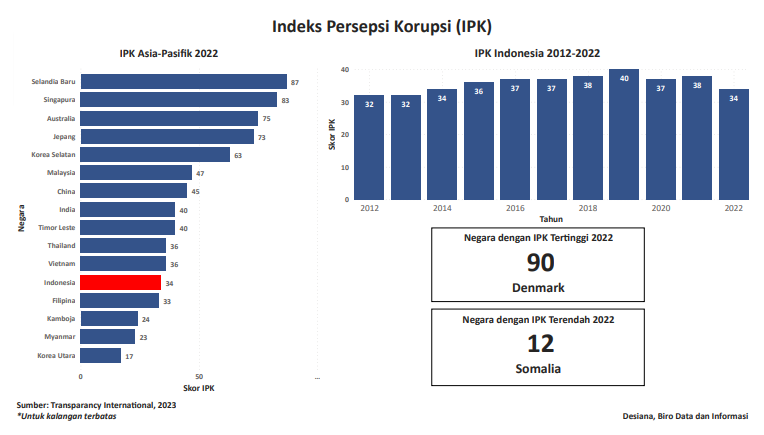 Visualisasi ini menampilkan data indeks persepsi korupsi Indonesia pada tahun 2012-2022 dan indeks persepsi korupsi negara-negara Asia-Pasifik pada tahun 2022. Data dapat diakses melalui website Transparency International. Data yang ditampilkan update per Januari 2023.