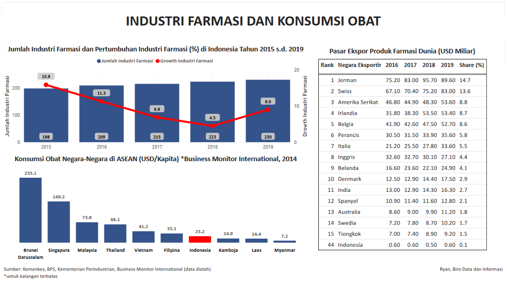 Visualisasi ini menampilkan jumlah industri farmasi dan pertumbuhannya di Indonesia sejak tahun 2015 hingga 2019. Data mengenai konsumsi obat diberbagai negara ASEAN juga menjadi salah satu topik dalam viusalisasi ini. Selain itu juga terdapat data pasar ekspor produk farmasi dunia per tahun 2016 hingga 2019 berdasarkan sumber dari Kementerian Kesehatan, BPS, Kementerian Perindustrian, dan Business Monitor International.