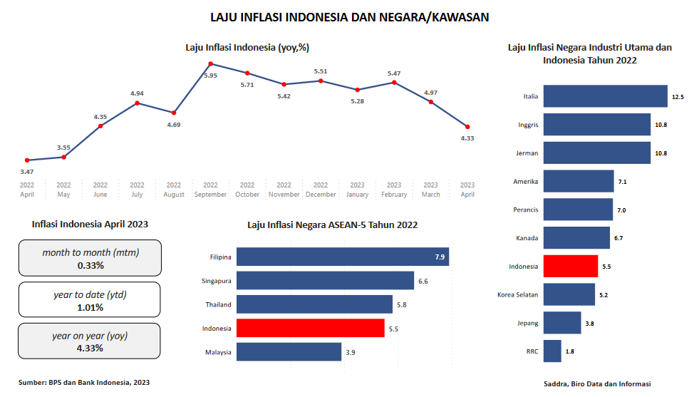 Visualisasi yang ditampilkan data laju inflasi Indonesia serta inflasi negara industri utama dan inflasi kawasan negara ASEAN-5, Data dapat diakses melalui website Badan Pusat Statistik dan Bank Indonesia. Data yang ditampilkan update bulan April 2023.