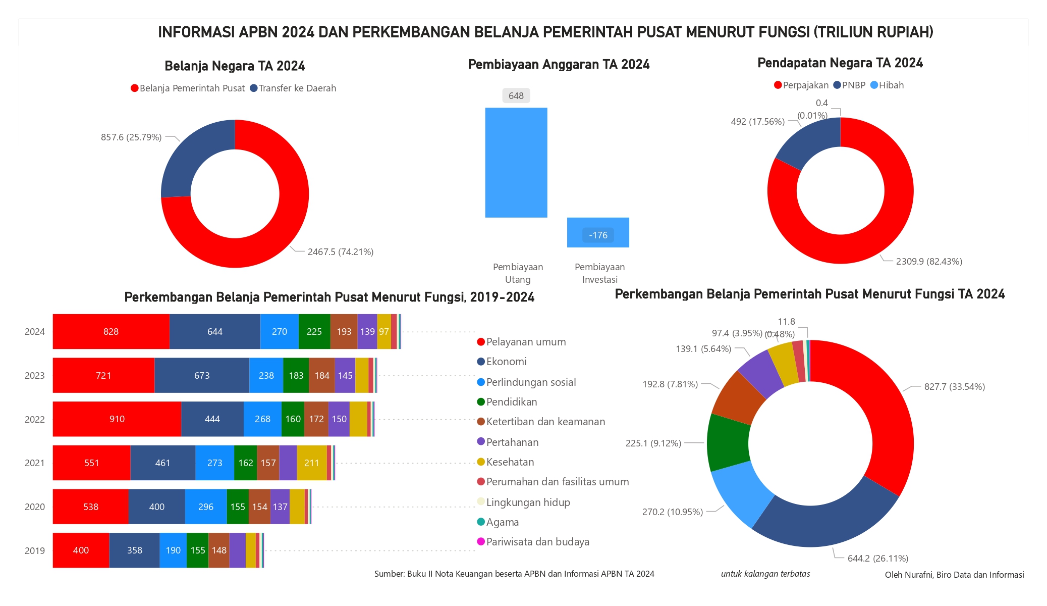 Visualisasi menampilkan informasi APBN Tahun Anggaran 2024 dan perkembangan belanja pemerintah pusat menurut fungsi. Data menunjukkan 82,43% pendapatan negara berasal dari pajak dan 74,21% belanja negara TA 2024 digunakan untuk belanja pemerintah pusat. Untuk TA 2024, pembiayaan utang naik menjadi Rp648triliun sementara pembiayaan investasi menurun menjadi Rp176triliun.