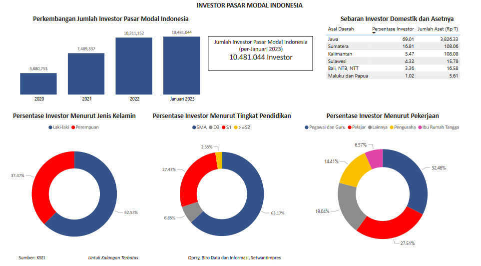 Visualisasi mengenai Investor Pasar Modal Indonesia meliputi informasi tentang perkembangan jumlah investor dan data demografi serta sebaran investor Indonesia.
