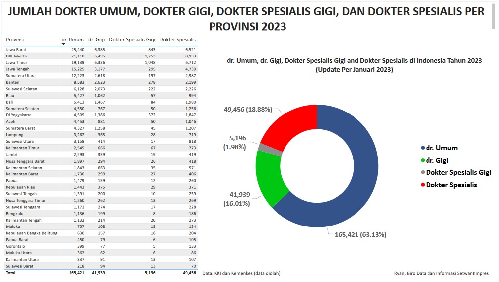 Visualisasi ini menampilkan jumlah dokter umum, dokter gigi, dokter spesialis gigi, dan dokter spesialis per provinsi di tahun 2023.