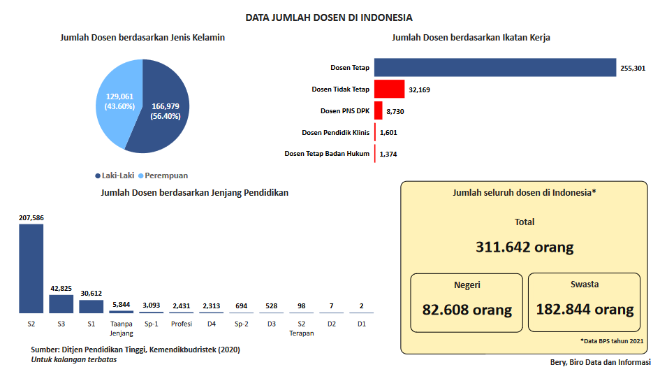 Visualisasi ini meliputi jumlah dosen di Indonesia disertai klasifikasi berdasarkan jenis kelamin, ikatan kerja, dan jenjang pendidikan. Data diperoleh dan dapat diakses melalui laman Dirjen Pendidikan Tinggi, Kemendikbud dan BPS. Data yang ditampilkan berdasarkan update per April 2023.
