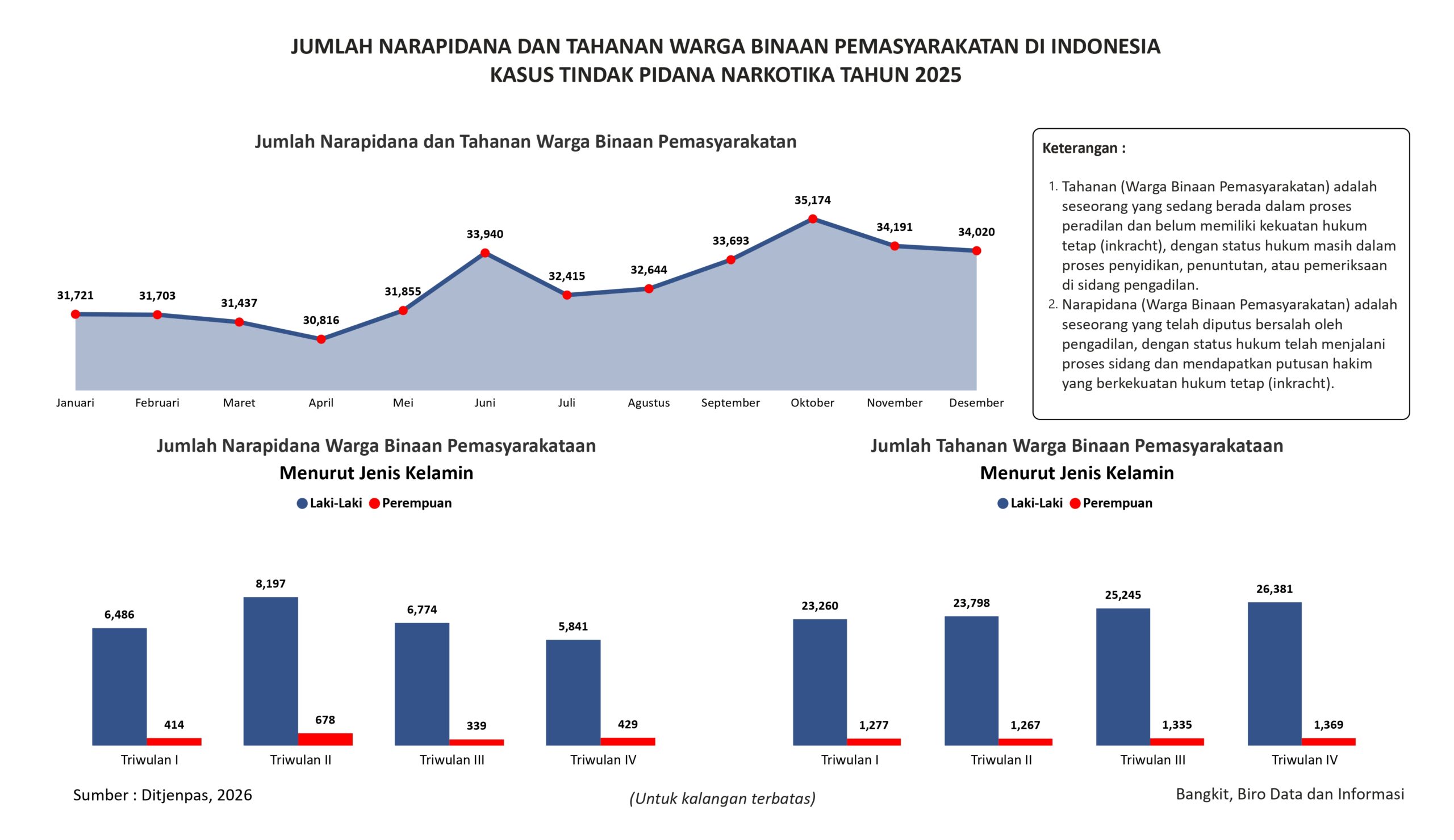 Visualisasi ini menyajikan data statistik mengenai jumlah narapidana dan tahanan kasus narkotika di Indonesia sepanjang tahun 2025. Secara umum, jumlah total warga binaan mengalami fluktuasi dengan tren meningkat di akhir tahun, mencapai puncaknya pada bulan Oktober sebanyak 35.174 orang. Data ini juga membedakan antara “Tahanan” (yang masih dalam proses peradilan) dan “Narapidana” (yang sudah memiliki kekuatan hukum tetap).