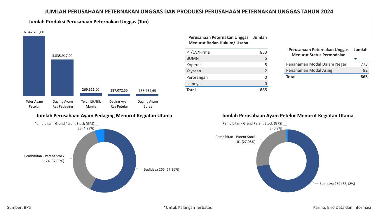 Visualisasi ini menampilkan data jumlah produksi perusahaan peternakan unggas, jumlah perusahaan peternakan unggas menurut badan usaha/usaha, jumlah perusahaan peternakan unggas menurut status permodalan, jumlah perusahaan ayam pedaging menurut kegiatan utama, dan jumlah perusahaan ayam petelur menurut kegiatan utama pada tahun 2024. Data bersumber dari BPS.