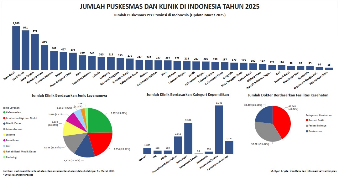 Visualisasi ini menampilkan beberapa data diantaranya yaitu jumlah Puskesmas per Provinsi di Indonesia tahun 2025, Jumlah Klinik berdasarkan pelayanannya dan kepemilikannya, serta jumlah dokter di pelayanan kesehatan (Rumah Sakit, Puskesmas, dan Layanan Kesehatan lainnya).