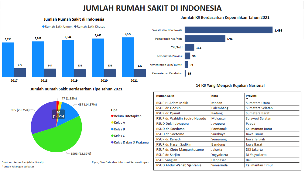 Visualisasi ini menampilkan beberapa data diantaranya jumlah rumah sakit umum dan rumah sakit khusus di Indonesia, jumlah rumah sakit berdasarkan kepemilikan tahun 2021, jumlah rumah sakit berdasarkan tipe, serta terdapat 14 rumah sakit yang menjadi rujukan nasional di Indonesia.