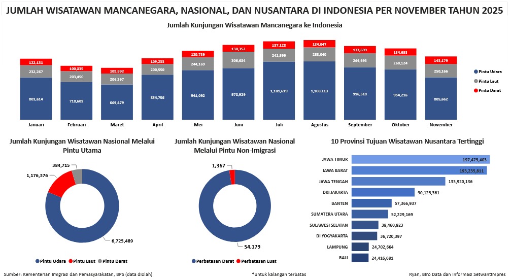 Visualisasi ini menyajikan beberapa data terkait dengan jumlah wisatawan mancanegara yang datang ke Indonesia melalui pintu utama imigrasi, jumlah wisatawan nasional yang berkunjung keluar negeri melalui pintu utama imigrasi dan non-imigrasi, serta 10 Provinsi Tujuan Wisatawan Nusantara Tertinggi Per November 2025.