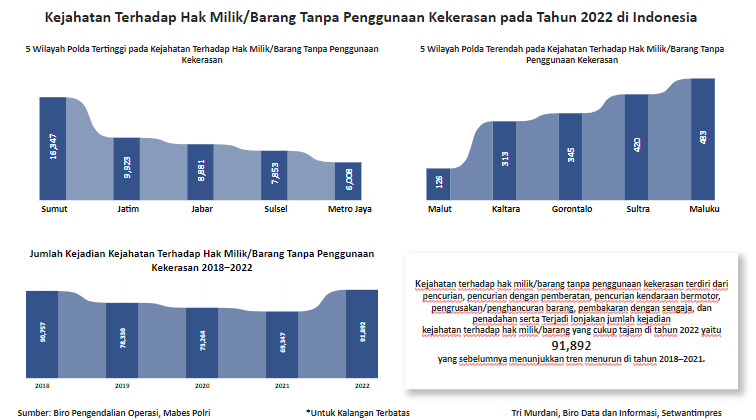 Visualisasi ini menunjukkan data kejahatan terhadap hak milik/barang tanpa penggunaan kekerasaan pada tahun 2022 di Indonesia.