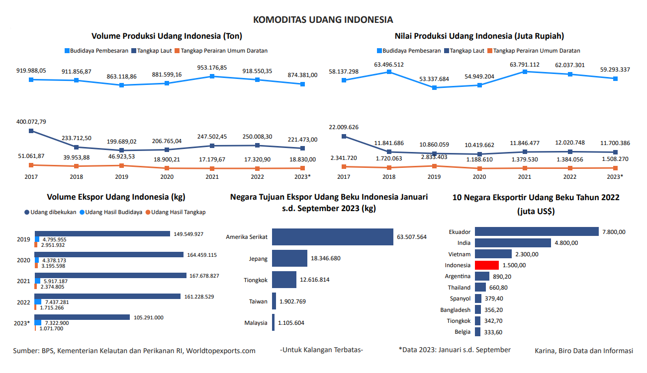 Visualisasi ini menampilkan data Volume dan Nilai Produksi Udang Indonesia, Volume Ekspor Udang Indonesia, Negara Tujuan Ekspor Udang Beku Indonesia Januari s.d. September 2023, serta 10 Negara Eksportir Udang Beku Tahun 2022. Data bersumber dari BPS, Kementerian Kelautan dan Perikanan, Worldtoexports.com.