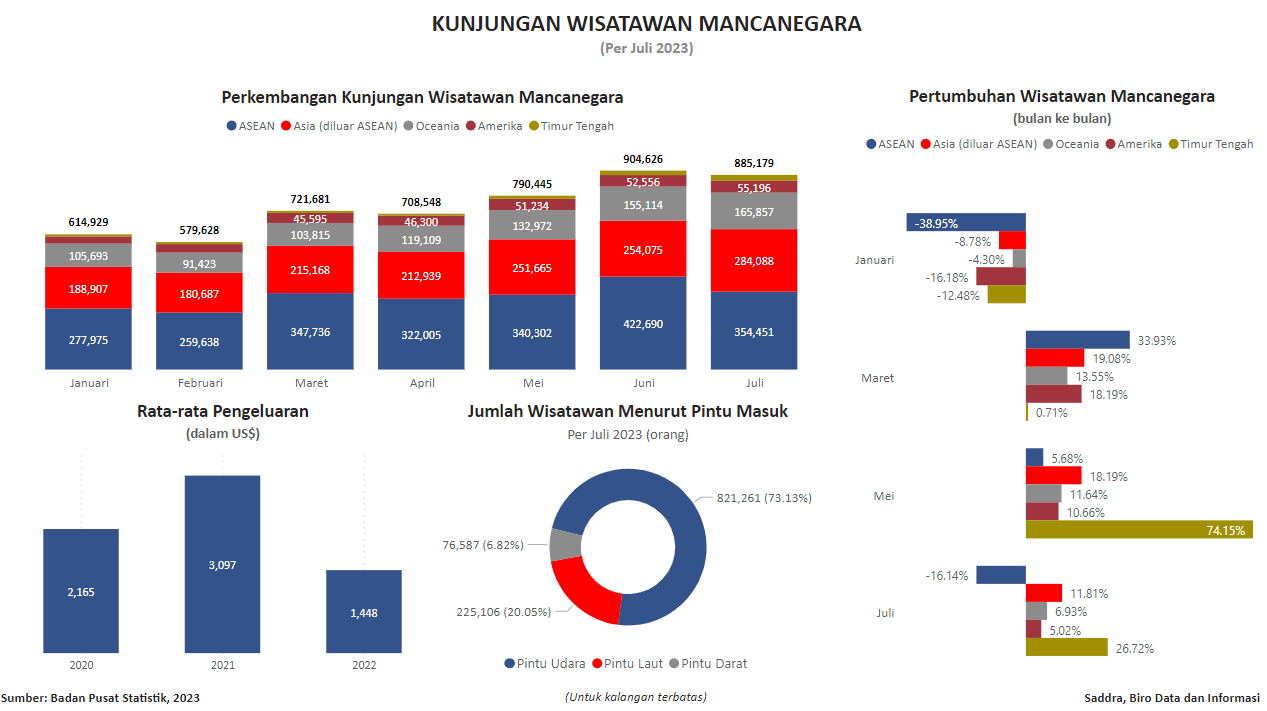 Visualisasi ini menampilkan data perkembangan kunjungan wisatawan mancanegara ke Indonesia. Data dapat diakses melalui website resmi BPS. Data yang ditampilkan update per Juli 2023.