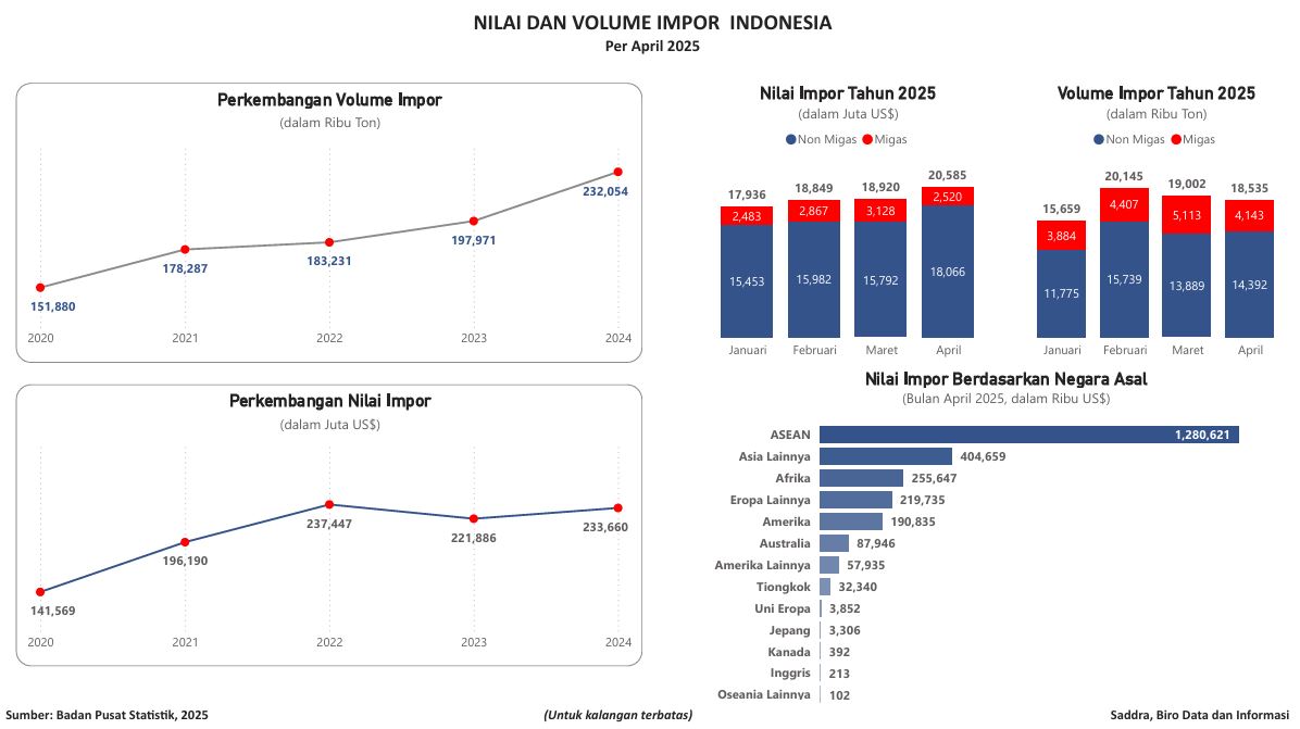 Visualisasi yang ditampilkan merupakan data perkembangan nilai dan volume impor tahunan Indonesia periode 2020 s.d. 2024, perkembangan nilai dan volume impor bulanan Indonesia periode Januari s.d. April 2025, serta nilai impor bulan April 2025 berdasarkan kelompok negara impor. Data dapat diakses melalui website Badan Pusat Statistik. Data yang ditampilkan update bulan Juni 2025.