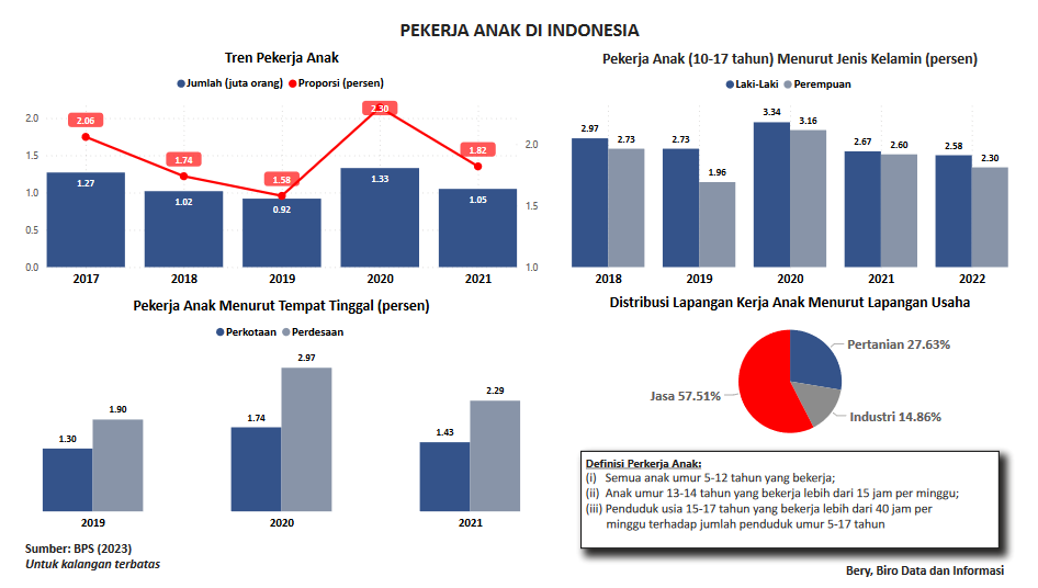Visualisasi ini menampilkan tren pekerja anak di Indonesia dari tahun ke tahun (2017 s.d. 2021), lapangan pekerjaan anak, dan berdasarkan jenis kelamin serta tempat tinggal. Data tersebut diperoleh dari website BPS dan update terakhir diakses pada Agustus 2023.